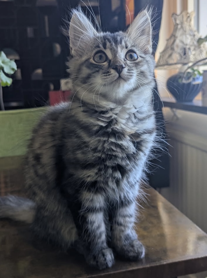 Nyx är en lurvig kattunge som kommer behöva en del pälsvård. Hon är rätt självständig jämfört med sina syskon. Kattungar får inte adopteras ut ensamma om inte det finns annan katt i hemmet. Nyx är chippad, avmaskad och grundvaccinerad. Kastrering vid 6 månaders ålder ingår i priset. Nyx finns i jourhem i Kinna, Marks kommun