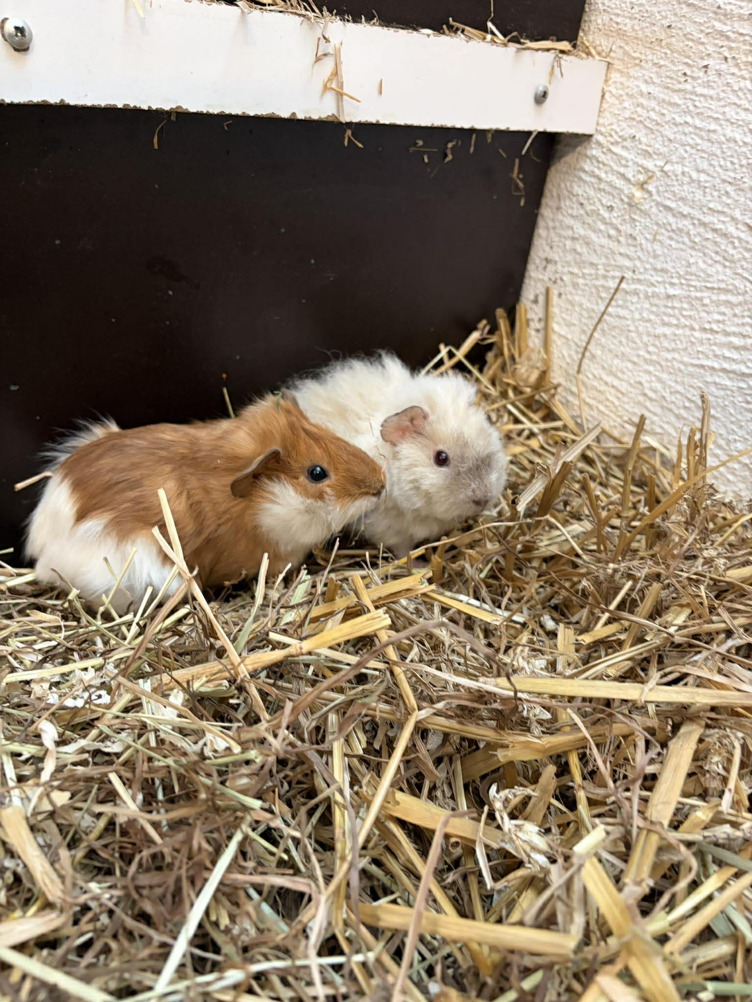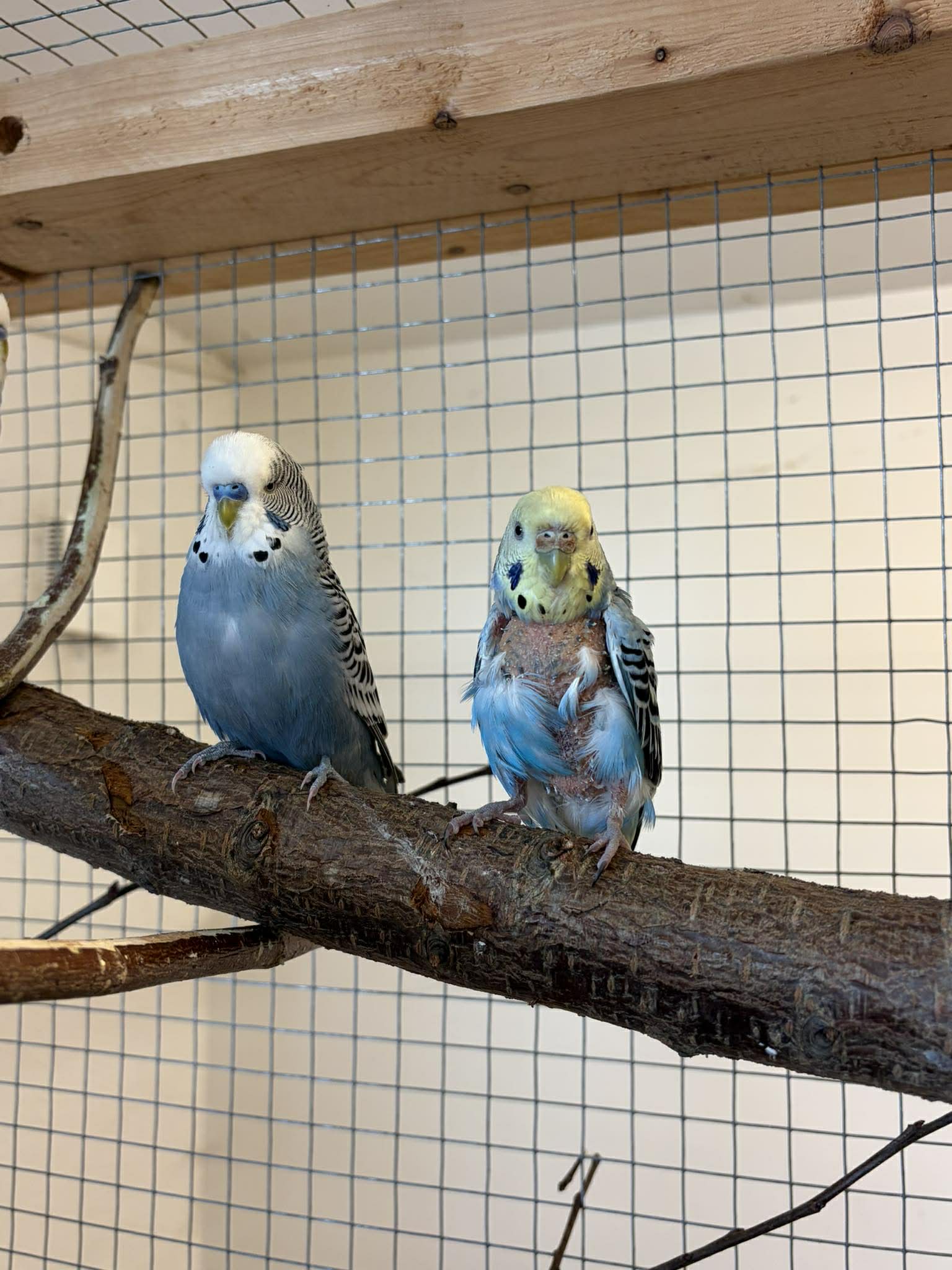 Levi och Jo kom till oss när deras familj inte ville ha kvar dom. Jo var akut sjuk när hon kom till oss. Hennes mage var så svullen att hon hade svårt att andas och smärtan gjorde att hon hade börjat plocka sina fjädrar. Hon hade en omfattande inflammation i sin äggledare. Hon har nu blivit behandlad och mår mycket bättre. Fjädrarna är på väg att växa ut igen!