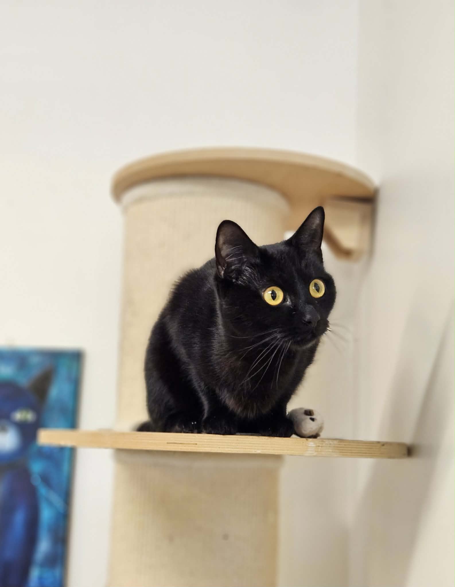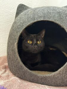 Hon är en vänlig och social katt som gärna är med människor och blir klappad. Hon går nyfiket runt på avdelningen och kollar läget hos de andra katterna. Hon är väldigt intresserad av sin grannkatt, en treårig hona. Men hanarna, fy! Då vänder hon på klacken och går tillbaka till oss!
